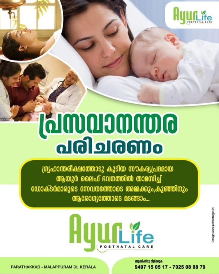 ഗൃഹാന്തരീക്ഷത്തിൽ പ്രഗത്ഭരായ ഡോക്ടർമാരുടേയും വിദഗ്ധ തെറാപ്പിസ്റ്റുകളുടേയും സമ്പൂർണ്ണ പ്രസവാനന്തര ശുശ്രൂഷയിലൂടെ അമ്മക്കും കുഞ്ഞിനും ആരോഗ്യവും സൗന്ദര്യവും നിലനിർത്താം...
